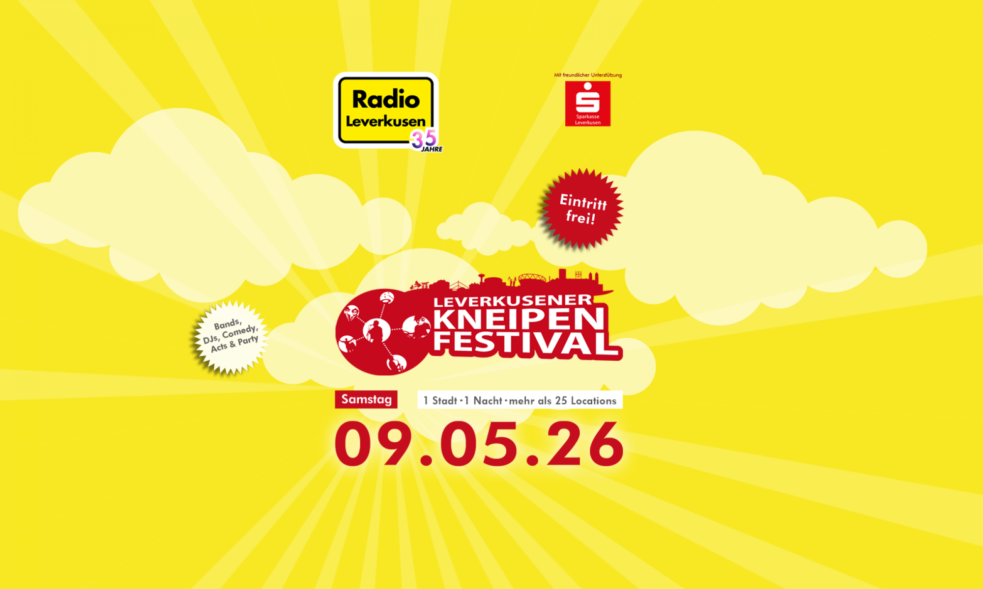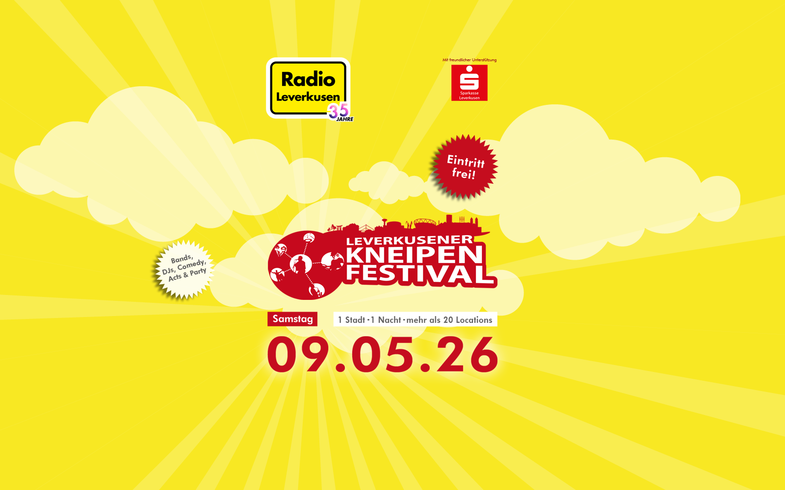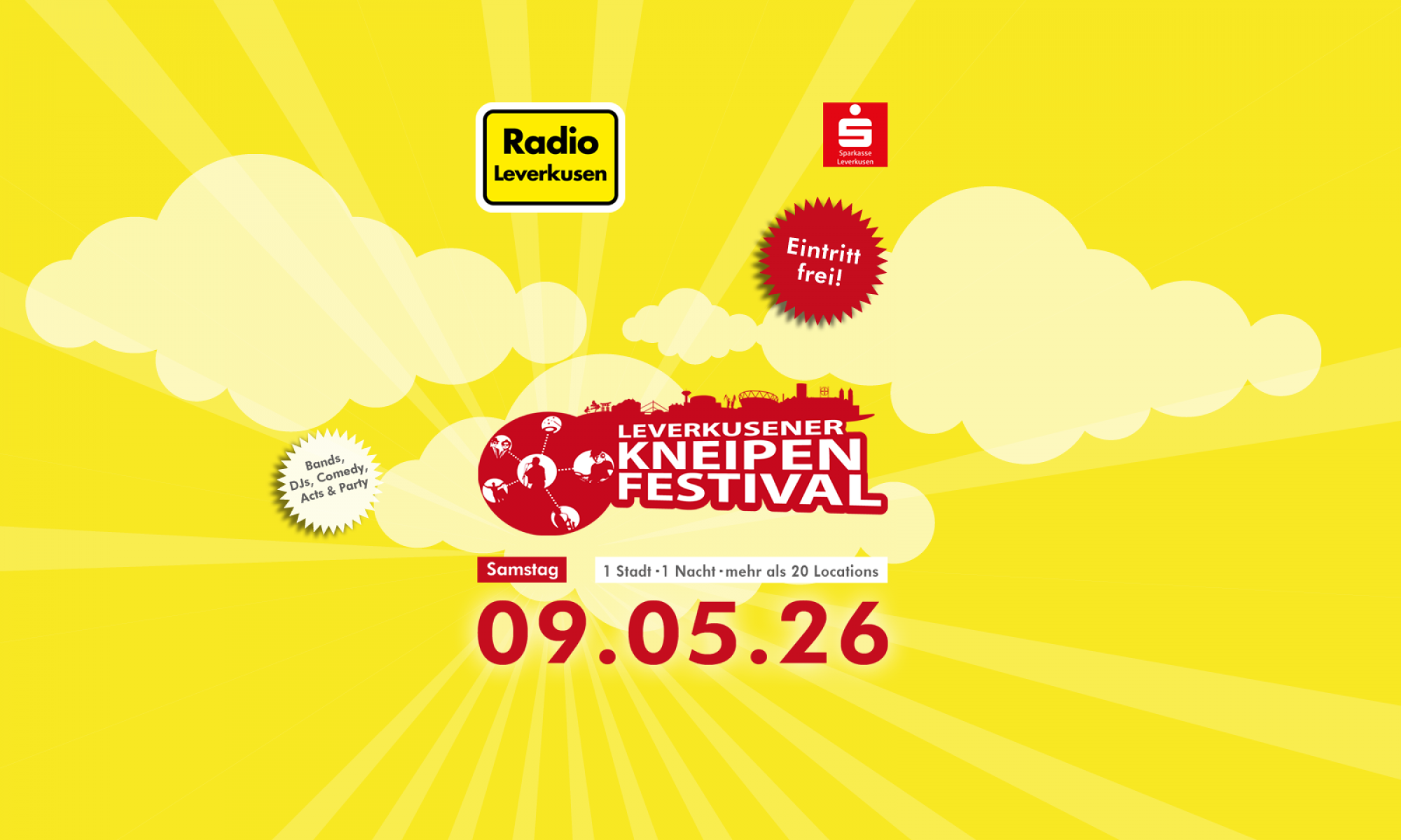 Am Samstag, den 9. Mai 2026, verwandelt sich ganz Leverkusen in eine große Musik- und Feierlandschaft: Das Kneipenfestival steht vor der Tür – präsentiert von Radio Leverkusen!